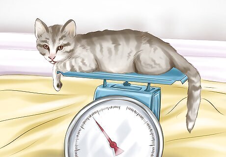 Do weekly weigh ins. Once you have determined your pet’s body condition score, you can help your dog or cat to lose, gain, or maintain her weight. As you work with your pet, you need to do weekly weigh ins to track your progress. Keeping track of your pets progress through weekly weigh-ins is a great way to keep you on track and moving toward your pet’s weight goal. It might be hard to weigh your cat. Do the best you can with the scale you have.