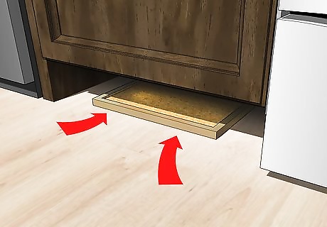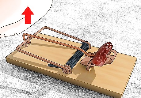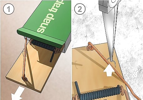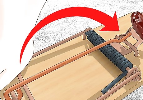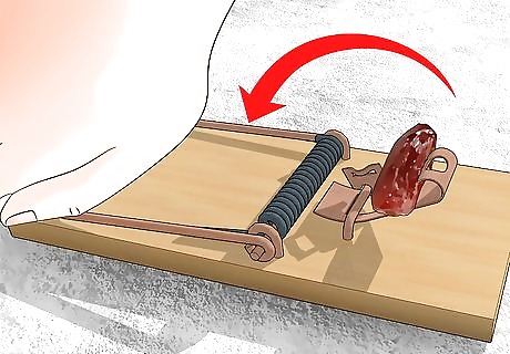 Place the snap trap perpendicular to a wall. Since rats don't normally run out in the open, it's best to place the traps near walls and in tight crevices that rats frequent. Place traps near places where you store food, as well. Rats favor dark, damp places. You can place traps under kitchen appliances, under furniture, in cupboards and pantries, and in closets. Be careful not to trigger the trap when you're placing it.