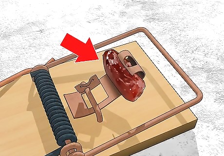 Place your bait on the copper bait pedal. Peanut butter is a popular bait for woodrats, but you can also use dried fruit, pet food, or nuts. To make sure the bait stays in place, you can use dental floss to loosely tie it to the pedal. Woodrats are also attracted to nesting materials, such as cotton balls, yarn, dental floss, and twine. These can all be used as bait in place of food.
