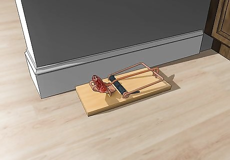 Place traps strategically throughout your home and yard. Cage traps work best outside or in large, open areas like basements or attics. Glue traps are recommended to be placed against a wall in high-traffic areas like cupboards and under appliances. Glue traps and cage traps are less likely to harm children and pets, but still require a level of care when placing them. Make sure family pets aren't able to access cage traps, and place glue traps out of the reach of children.
