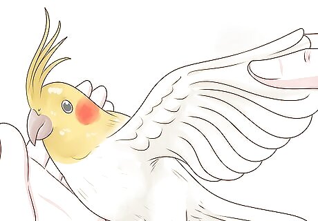 Examine their body to determine if they are healthy. A healthy cockatiel will have clear open eyes and smooth clean feathers. They should be alert and energetic. Give the bird a quick inspection to make sure they are generally healthy. The feathers over the body should lie flat. If the feathers are ruffled or patchy, the bird may be stressed or ill. If the cockatiel is sitting with the feathers puffed up and the eyes half-closed, it may mean that the bird is sick. Check the beak to make sure that there are no cracks, flakes, or crookedness. Lift up the bird, and examine their underside. If it is wet or dirty, it may mean that the bird has diarrhea.