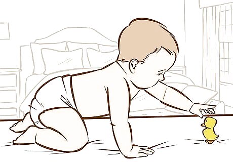 Pay attention to large motor skills. One aspect of development is large or gross motor skills. This skill is your baby's ability to make large movements, such as crawling, standing, and walking. By 1 month, your baby should be able to lift their head a bit when they're on their stomach. By 3 months, they'll be working rolling over, though they'll likely just be pushing themselves up a bit with their arms. By the time your baby is a 6-month-old, they'll be pulling themselves up to sit, which they can do with some support. They'll also enjoy exploring with their hands. By one year, your baby should be crawling, but they could have already moved on to walking. They'll also be pulling themselves up to stand and sitting on their own.