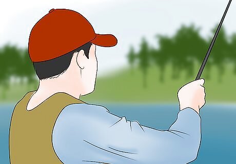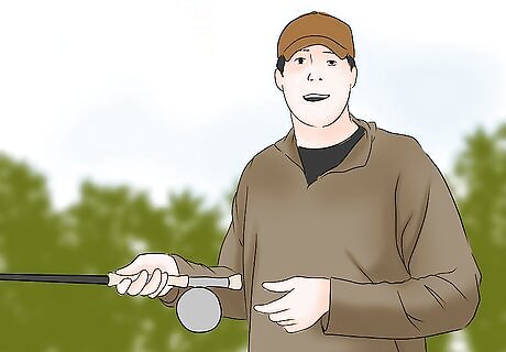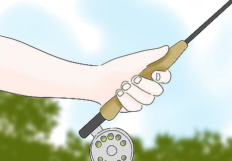 Hold the fishing rod like you are shaking a hand. Hold it in the center of the grip with your thumb up. Place your line between your first finger and the fly rod. Pull 8 to 10 yards (7.3 to 9.1 m) of extra line. Cast your line horizontally using your thumb and wrist to flick toward your target.