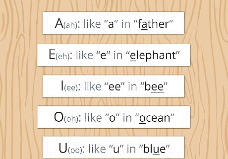 Practice the 5 Hawaiian vowels. The Hawaiian language has the same 5 vowels English does: a, e, i, o, and u. Unlike in English, each of these letters has only 1 sound. Long and short vowels do not make different sounds. A is an ah sound, like the a in the English word father. E is an eh sound, like the e in elephant. I is an ee sound, like the ee in bee. O is an oh sound, like the o in ocean. U is an oo sound, like the u in blue.