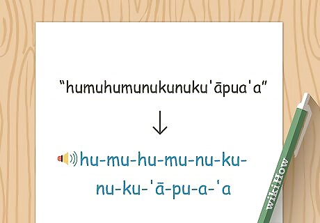 Break Hawaiian words into syllables. Hawaiian words often have a length that can seem intimidating if you aren't familiar with the language. Syllables in Hawaiian are only 1 or 2 letters long, and never end in a consonant. A single vowel can be a syllable, but a single consonant is never a syllable. For example, try this word: humuhumunukunuku'āpua'a (it's the word for the Hawaiian state fish). If you remember that the 'okina is a consonant, you can break it down easily into syllables like this: hu-mu-hu-mu-nu-ku-nu-ku-'ā-pu-a-'a. Pronounce the letters as you've already learned, and this seemingly intimidating word becomes relatively easy to say. The Hawaiian rules for syllables are also helpful with shorter words. For example, take the word honu (the Hawaiian word for "turtle). At first glance, you might pronounce it hone-oo. But recall that a Hawaiian syllable cannot end with a consonant, and can only be 1 or 2 letters. The correct pronunciation, therefore, is hoh-noo.