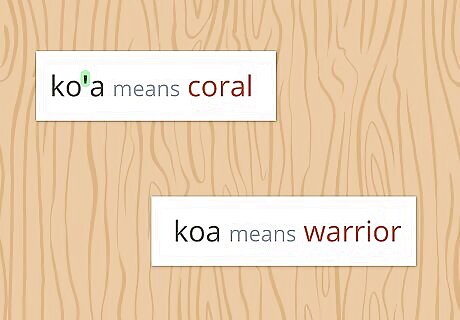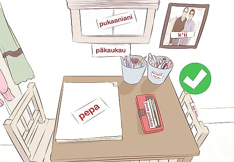 Label items around your home with their Hawaiian words. Use an online Hawaiin/English dictionary, such as the one found at http://wehewehe.org/, to learn the words for objects you frequently see and interact with around your home. You can write the Hawaiian word on a sticky note and stick it to the object. Start with larger, more basic objects, and move to more detailed things. For example, you might start in your fridge with major appliances, and then label food in your fridge and panty. Keep in mind that many of these words will be English loan words, so they may not be any different from what you already know. Leave labels for words that are different in Hawaiian than they are in English.