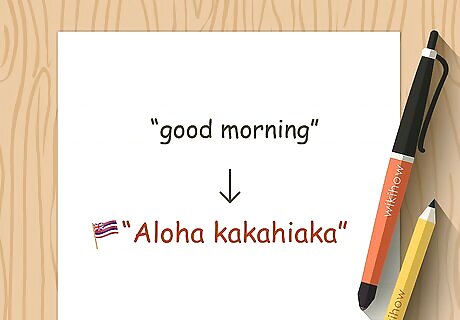 Use variations of the word aloha. You are likely familiar with aloha, a Hawaiian greeting that is also symbolic of the island lifestyle. By adding other words to aloha, you can greet people at different times of the day. Aloha kakahiaka means "good morning." Use it in the early morning hours, before 10:00 a.m. Aloha awakea roughly means "good noontime." Use it late morning and midday, between the hours of 10:00 a.m. and 2:00 p.m. Aloha 'auinalā means "good afternoon." Use it between the hours of 2:00 p.m. and 5:00 p.m. Aloha ahiahi means "good evening." Use this greeting after 5:00 p.m.