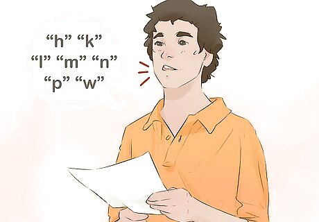Say most consonants the same as you would in English. The Hawaiian alphabet has a total of 7 consonants, 6 of which are always pronounced exactly the same as they are in English. There are only 12 letters total in the Hawaiian alphabet, so if you can speak English you already know how to pronounce half of the Hawaiian letters. W is the exception. When it comes after an a, it can be pronounced either like an English v or like an English w (as in "Hawaii"). It is pronounced like an English v when it follows an i or an e, and like an English w after a u or o.