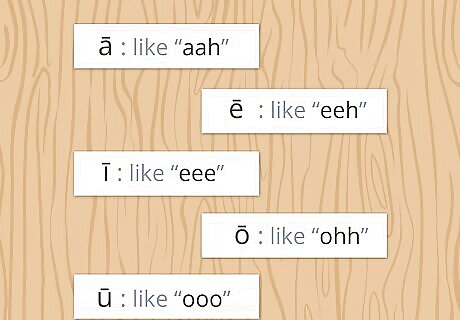 Draw out vowels with a macron ( ¯ ) over them. A macron (called a kahakō in Hawaiian) is used to indicate a long vowel. They have the same basic sound as the regular vowel, you just draw the sound out a bit longer. ā sounds like aah. ē sounds like eeh. ī sounds like eee. ō sounds like ohh. ū sounds like ooo. This can take some practice if you are a native English speaker, since how long you draw out a vowel makes no difference in how an English word is understood. However, ignoring the difference can lead to some serious miscommunications. For example, the word maka means face, while the word māka means target.