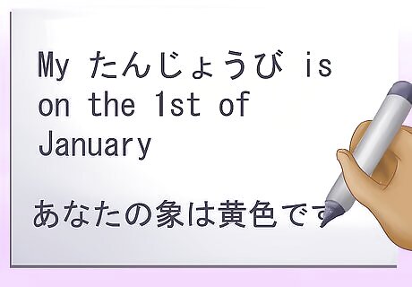 Write a sentence. The structure can be different. For example you can include the Japanese word into an English sentence, or you can make a Japanese sentence. Here are shown both ways: My TANJOBI (たんじょうび) is on the 1st of January. My birthday is on the 1st of January. あなたの象は黄色ですAnata no zou wa kiiroi desu. Your elephant is yellow.