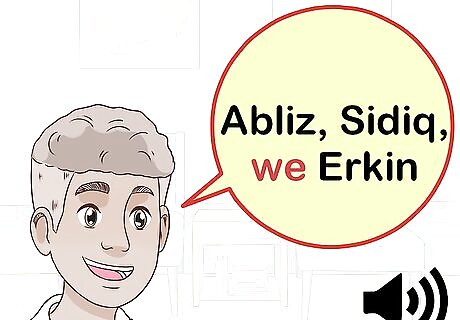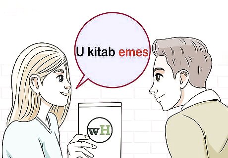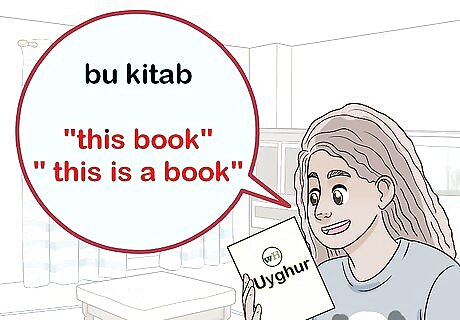 Juxtapose words to show equivalency. Uyghur does not have a verb similar to the English verb "to be." If you want to say what something or someone is, you simply put the two words next to each other. For example, the literal translation of bu kitab in Uyghur is "this book." However, its meaning is "this is a book." Use the same pattern with people. For example, Meryem oqughuchi means "Märyäm is a student" (literal translation: "Märyäm student").