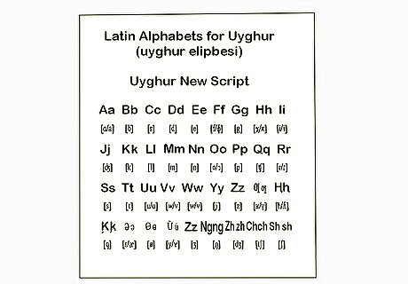 Choose the alphabet you want to study. The Uyghur language can be written using Cyrillic, Latin, or Arabic characters. Which alphabet you choose to study may depend to some extent on whether you plan to travel to an area where Uyghur is spoken. If your first language is English or a European language, you may find it easier to learn Uyghur with the Latin alphabet. If you plan to travel in Russia, or in former Soviet republics, such as Kazakhstan, study the Uyghur Cyrillic alphabet. The Arabic alphabet is used primarily by Uyghurs in China. However, the Latin alphabet is also used in the same areas as an auxiliary alphabet. Kansas University has an introductory textbook for the modern Uyghur language available to download for free at https://kuscholarworks.ku.edu/handle/1808/5624. This textbook includes a comparison chart of the characters in each alphabet.