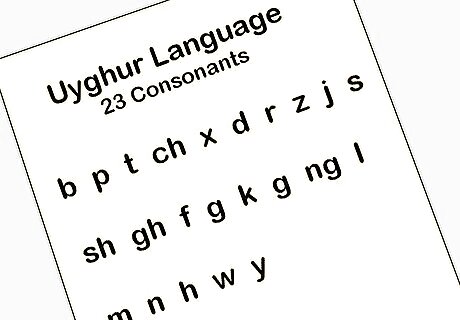 Start with the consonant sounds also found in English. There are 23 consonants in the Uyghur language: b, p, t, ch, x, d, r, z, j, s, sh, gh, f, g, k, g, ng, l, m, n, h, w, and y. When using the Latin-based alphabet, most of these consonants are pronounced the same or similarly to their English equivalents. For example, the Uyghur j is pronounced like the j in the English word "judge." The ch in Uyghur is pronounced like the ch in the English word "itch."