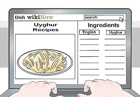 Cook Uyghur recipes and learn the names of the ingredients. Search online for simple Uyghur dishes that you can cook at home. You may even be able to find recipes written in Uyghur. However, even if the recipe is in English, you can still learn a lot through cooking and eating traditional foods. In addition to cooking the food, look up information about the cultural traditions associated with that particular dish. For example, it may be a standard daily meal or something only eaten on special occasions. If your recipe is in English, find the Uyghur words for the ingredients and repeat them as you cook your meal.