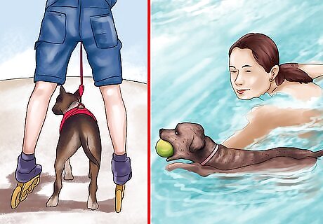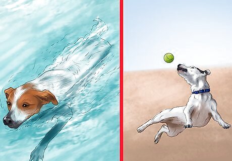 Get activity you and your dog enjoy. Just like people, every dog has a distinct personality. Your dog may run or play harder in certain place or with specific activities. Take at least one day to do something with your dog that you both enjoy but can’t get to daily. You could do any of the following “doggy and me” activities: Running Inline skating Bicycling Hiking Swimming Jumping over obstacles
