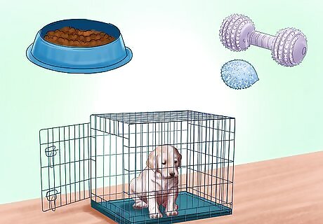 Place toys in the den. Your high energy dog will still need activity even in a doggy den. Providing it toys can help your dog get exercise and entertainment until you get home. Consider putting the following toys in your dog’s space: Hard rubber toys for chewing and carrying around Rope toys Balls “Busy box” toys with hiding places for snacks. Soft, stuffed and/or squeaky toys Chew toys