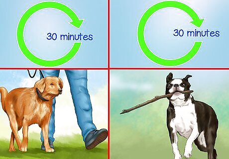 Establish a regular activity schedule. High energy dogs need regular exercise as a result of their evolution. Your breed may require as many as 2 ½ hours of activity every day. This may be a lot of time if you are very busy. Setting a daily activity schedule can keep your high energy dog healthy and happy. The routine helps your dog anticipate it and may minimize unwanted behaviors. Establish a specific time every day for 30 minutes of vigorous activity with your dog. For example, set aside 30 minutes every morning to run. If you don’t run, let your dog run in an enclosed yard or dog park for 30 minutes. You could also play fetch or blow bubbles specifically designed for dogs to chase. Incorporate a brisk walk of about an hour every day, too. Break this into two 30-minute walks if need be. Adjust your dog’s exercise routine as necessary. For example, if you have an appointment and get home early, use the extra time to engage your high energy dog.