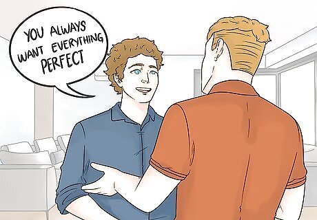 Try not to overreact if the perfectionist annoys you. Though it can be challenging to live with a perfectionist, you should try to not to snap or freak out if the perfectionist annoys you. Take a few deep breaths and then ask the perfectionist if you can discuss the issue together in an open and respectful way. You may propose that you both practice active listening and take turns listening to each other discuss the issue. Doing this will keep the conversation civil and help you both reach a compromise. For example, you may start by saying to the perfectionist, "I am struggling with your expectations for maintaining the kitchen. I work late and am not able to clean up until the morning. But I am aware that waking up to a dirty kitchen annoys you and you then nag me about it. Is there a way we can compromise on this issue?" You should then listen intently while the perfectionist responds to your question. Do not interrupt the perfectionist or cut them off. Work together to come up with a compromise, rather than fight about the issue.