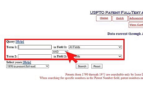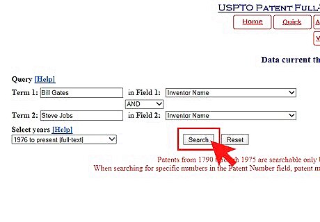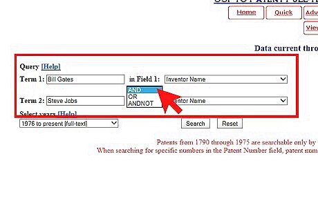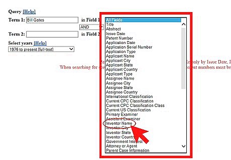 Define the fields of your search. After entering your search term, use the drop-down menu to tell the database where that term is located on the patent. If you don’t specify the field, the form defaults to searching all fields. For example, if you were searching for all patents issued to Bill Gates as an inventor, you would enter “Bill Gates” in the blank for “Term 1” and then specify “Inventor Name” as the field for that term.