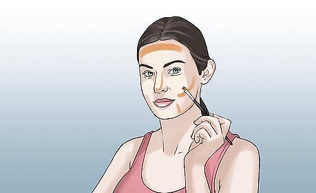 Add contouring on the rest of your face. Contouring is the application of creams in colors that are slightly darker and slightly brighter than your skin tone to create more defined ridges and shadows on your face. For instance, you can use contouring on your cheeks to help reduce the look of puffiness. For highlighting, try making a "fish face" by pursing your lips. That helps draw your cheeks in so you can see your cheekbones, where you can add some highlighter. Be sure to blend it in. For more definition, you can add a bit of shadowing just under your cheekbones. Another place to add a dab of highlighter is under your chin. You can also just use a bit of bronzer to brighten up your face. Brush it along the top of your forehead, cheekbones, nose, and chin.