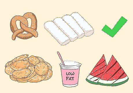 Snack on IBS-friendly foods in between meals. There are some great, low-calorie snack options that you can include in your diet to help you stay satisfied between meals. Try to include a mid-morning snack and a mid-afternoon snack to curb cravings and keep you from overeating at meal times. Some good choices include: Pretzels Rice cakes Baked potato chips Low-fat yogurt Cooked or peeled fruit