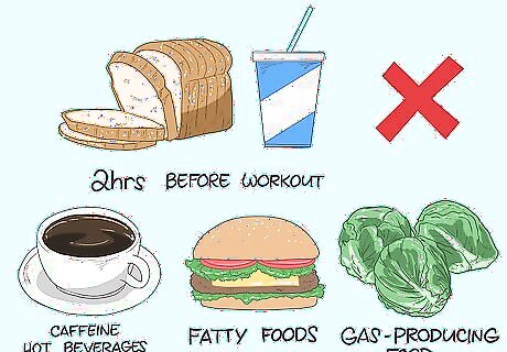 Time your workouts when your IBS symptoms are mild or not present. For many people, the best time to work out is first thing in the morning. However, you can choose another time of day if that works better for you. To reduce IBS symptoms before your workout, avoid: Eating or drinking 2 hours before your workout Caffeine and hot beverages Fatty and gas-producing foods