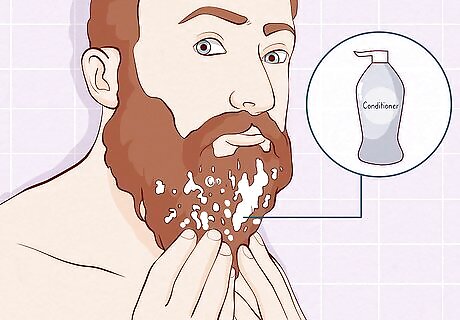 Wash your beard. Drop some beard wash in your hands and rub them together. Slowly rub the beard and make sure all hairs have been covered. Rinse the beard out with warm water. Dry the beard by patting it with a towel. The best place to wash your beard is in the shower, although it can also be done at the bathroom sink. Use a shampoo designed specifically for beards for the best results. If you don't have any beard shampoo, you can still use regular hair shampoo though. Be gentle with the towel otherwise hairs may be pulled out.