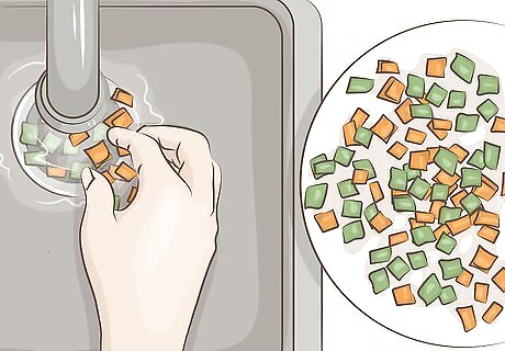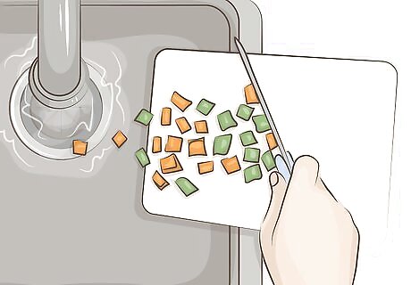 Drop the food down the disposal slowly. Grab your food scraps and drop them into the disposal one handful at a time. Try to avoid overloading the disposal, as that can clog the blades and cause expensive repairs. Wait until you stop hearing a grinding noise in the disposal to drop another handful in.