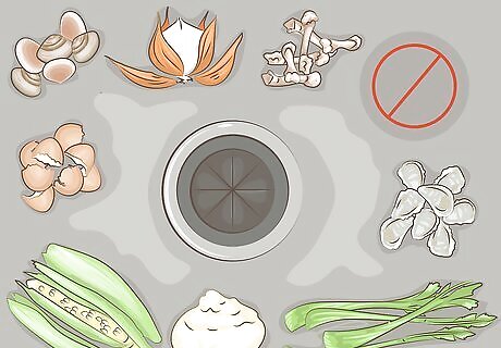 Avoid pouring grease, starch, or non-food items into your disposal. Garbage disposals are made for food scraps only, meaning you should never pour anything inedible down them. Similarly, grease and fat can solidify inside of the disposal, causing it to clog or jam. And, starchy foods like corn husks, artichokes, and large amounts of vegetable peels can also cause clogs and jams. Foods to avoid putting down your disposal include: Oyster shells Clam shells Large amounts of egg shells Coffee grounds Expandable foods, like pasta Grease or fat Animal bones Corn husks Celery stalks Onion skins