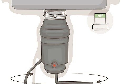 Turn the blades manually with an allen wrench to unstick them. If the disposal makes a humming noise when you turn it on, it could be because the blades are stuck. Turn off the power supply to your garbage disposal before you start. Grab an Allen wrench and find the small opening near the red reset button, then turn the Allen wrench clockwise to spin the blades. You may have to wiggle the allen wrench back and forth a few times before it works. You should never manually turn the blades while your disposal is on.