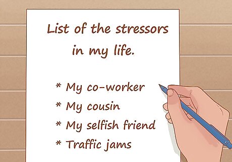 Write down a list of the stressors in your life. Your sources of stress might be related to your job, your family life, your friend circle, traffic jams, world events, or any number of other things. Creating a list of everything that makes you feel stressed is the first step toward overcoming your excess stress. Excess stress can increase your blood pressure, which is a gateway to other cardiovascular problems. Also, stress can lead you to make unhealthy lifestyle choices as a coping mechanism.