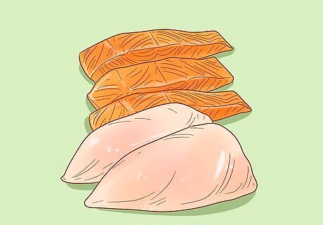 Eat poultry and fish instead of red meat. Poultry and fish have far less cholesterol-increasing saturated fat than red meats like beef and pork. Also, many types of fish, especially salmon, trout, and herring, contain Omega-3 polyunsaturated fatty acids that help strengthen your heart muscle. Remove the skin and trim excess fat away from your poultry and fish, and bake or grill them instead of frying them. Aim for about 2-3 servings of lean meats (each portion is about the size of a deck of cards) per day. If you don’t eat meat, get your protein from sources like beans, peas, lentils, and tofu.