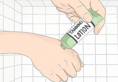 Use tanning lotions. Tanning lotions work to give your skin a darker look, lasting longer than other topically applied tanning methods. These lotions are easy to apply and can be a great way to keep your tan lasting during the winter months. If you notice your tan fading, try reapplying the lotion. Tans from tanning lotions will fade after a few days. Applying too much tanning lotion can cause your skin to turn very dark or orange. Some tanning lotions may also moisturize your skin. If you're left with lotion residue on your hands, try using a scrub with exfoliating microbeads to remove it.