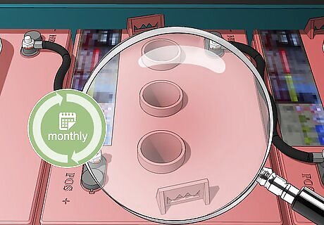 Check the batteries once a month. Get into the habit of checking the batteries routinely. At least once a month, the batteries in an electric golf cart will need to be refilled with distilled water. You should also clean the terminals and take the time to inspect the components for damage. Check the batteries frequently until you’re sure how much water they use. In warmer months, the batteries need to be refilled more frequently. Always inspect and recharge the batteries after storing the cart over the winter.