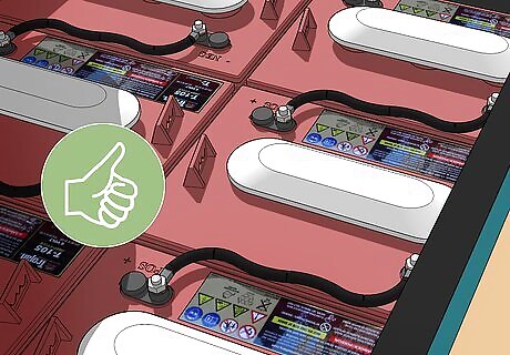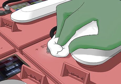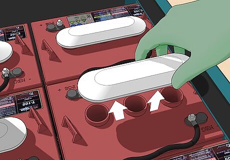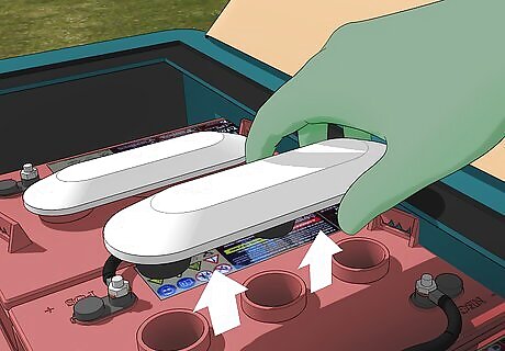 Open the vent caps on the batteries. Make sure your golf cart is turned off and unplugged before you touch the batteries. Open the compartment under the driver’s seat to access the batteries. The batteries will have plastic caps on top of them, which you can pull off by hand. The caps may have acid on them, so set them on the ground or a rubber mat. Avoid resting them against metal surfaces.