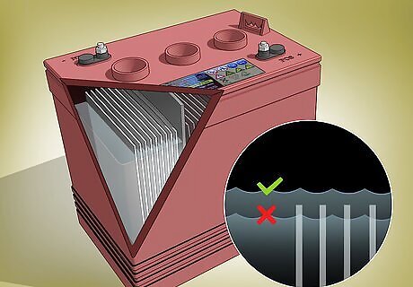 Add more water until the batteries are almost full. Avoid filling the batteries completely, or else you will end up with a nasty spill in your cart. Pour the distilled water in gradually, stopping when the water is about ⁄8 in (0.32 cm) below the rim. Stop pouring if you are in doubt about how much water to add. As long as the plates are submerged, they are protected.