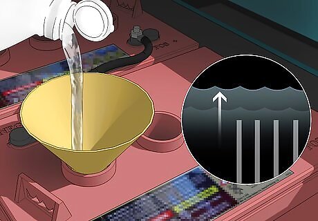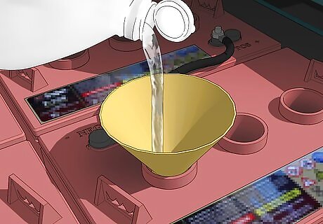 Fill the batteries partially with distilled water. Using a funnel or battery refilling system is helpful here to avoid making a mess. Fill each battery carefully until the water is right above the plates. You don’t want to fill the entire battery yet. After the plates are submerged, replace the battery caps. Distilled water has no extra minerals, so it is the best option. However, tap water is better than no water. You can usually find distilled water at supermarkets.