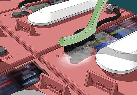 Brush the mixture onto the battery terminals. Dip a clean cloth into the mixture and wipe it over the acid. The type of cloth doesn’t matter. If you have an old toothbrush, you can also use it to spread the mixture and scrub it into the acid. The mixture is primarily meant to polish the terminals and connectors, but you can use it to wash off the rest of the battery.