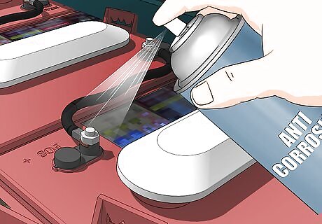 Spray an anti-corrosive onto the battery terminals and clamps. You can purchase a battery anti-corrosive spray online or from auto parts stores. Coat the terminals and the metal connectors on the battery cables every time you clean off the batteries. A regular anti-corrosive application after cleaning ensures your battery lasts as long as possible. If you need more space to work with, detach the cables from the terminals. This way, you can easily reach both parts. You can also use petroleum jelly or a silicone gel instead of the anti-corrosive spray. Ideally, clean the batteries off once a month. Doing this can make your batteries last up to 3 years longer than normal.