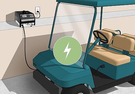 Charge your golf cart. Plug the cart into a battery charger. Allow the cart to stay motionless until the batteries have a full charge. In a worst-case scenario, this can take half a day, so hopefully your batteries aren’t completely depleted! Avoid letting the batteries overcharge. An automatic charger is helpful since it will turn off when the batteries are full. You can purchase a new charger online or at some auto parts stores. Choose a charger that is compatible with your cart.