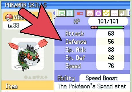 Understand how a Pokémon's stats affect its effectiveness. Different attacks do different damage based on your stats, and knowing how the stats work will help you craft an effective team. For example, if you have a Sweeper who uses mostly Special Attacks, like Luxray, you want to make sure it has a high Special Attack. If you are fighting a trainer with lots of Physical Attacks, like a rock gym, sub in a Pokémon with a high defense stat, like Shuckle. Attack: Affects the power of a physical attack such as Scratch or Tackle. Special Attack: Refers to mental or indirect attacks, like beam attack or environmental attacks. All non-physical attacking moves utilize the Special Attack stat. Defense: Determines the amount of damage taken by a physical attack. Special Defense: Determines the amount of damage taken by special attacks. Speed: Determines who attacks first. Speed stats are compared between the two fighting Pokémon and the fastest Pokémon attacks first. In a tie, it is chosen randomly.