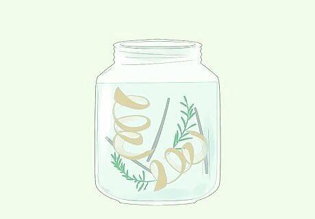 Add the orange twist and various herbs to the water. Place the orange twist into the water of the Mason jar, then add any attractive herbs or decorations you would like. Herbs like rosemary sprigs and cinnamon sticks add color and texture to the centerpiece. You can be creative and add any decorations that you wish, even things like marbles or pebbles.