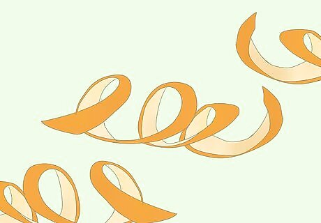 Cut the orange rinds into twists. Begin creating the orange twists by cutting off the bottom of the orange and placing it on a cutting board. Use a paring knife to begin making a slice into the orange in a downward motion at the top of the fruit. Make sure the cut is shallow so it doesn't cut through to the meat of the orange. Keep making the slice in a long continuous strip, moving the paring knife around the orange to cut the rind in a loop. Stop cutting when you reach the bottom of the orange. Cut as many orange twists as you want centerpieces. You will likely need a new orange for each twist.