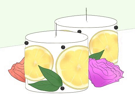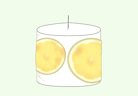 Select wide candles to decorate. Another great use of citrus slices in a centerpiece is to dry them and use them to decorate large candles. These centerpieces are great for great for fall or winter events, and give your tables an intimate and romantic feel. Select as many large candles as you need, keeping in mind that you may want a few candles for each centerpiece.[Image:Make a Citrus Slice Centerpiece Step 10.jpg|center]] Choose squat, wide candles that have a lot of space to decorate. Use neutral color candles, or candles that compliment the deep yellow, orange or green colors of the dried citrus fruit. Consider using deep colors like burgundy or dark purple, especially if you are using them for a fall or winter event like a Thanksgiving dinner or a fall wedding.