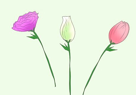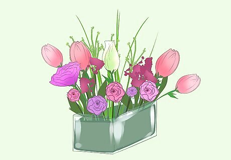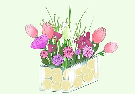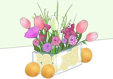 Pick what type of flowers you want. Use a mix of flowers in your arrangement so that it looks interesting and dynamic. Use a few colors that compliment each other, as well as a few different types of flowers to give your arrangements texture and variety. Ask your florist for advice on which colors and flowers look good together, or find inspiration from bridal catalogs or pictures of floral arrangements on the Internet. Consider what kind of citrus fruit you will be using before choosing the colors of your flowers. For instance, if you are using orange slices, you may consider adding a few orange flowers to compliment the orange slices. Because citrus slices give this arrangement a summery look, consider using light colors and pastels to keep with the summery theme.