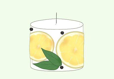 Add additional ornaments to the candles. You don't need to stop at the citrus slices when you decorate your candles; you can also add other decorative elements like dark leaves, herbs, beads or ribbon to offset the color of the citrus fruit.