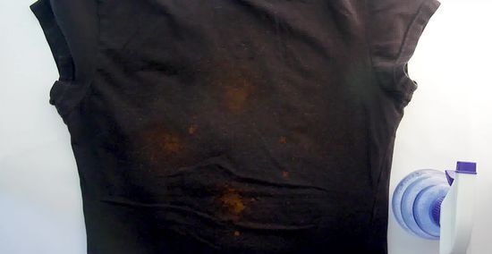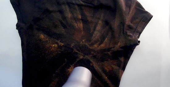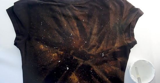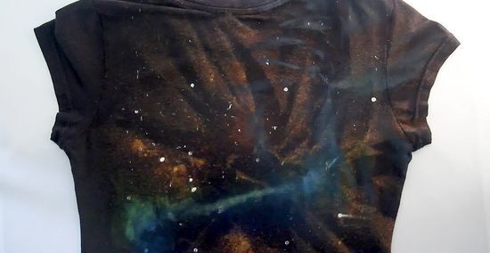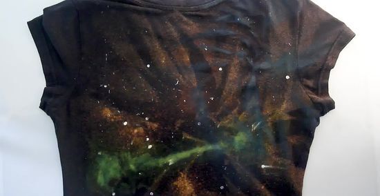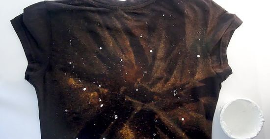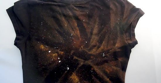 Spray the bleach onto the shirt. Randomly yet carefully spray the shirt with your bleach solution. Make some sprays close together and others further apart. Spraying the bleach near other bleach spots will create the appearance of connected star clusters, while spraying them further apart helps to create the illusion of depth and distance by making it appear as though there are other star clusters in the distance. The bleach will create a rusty red-orange color on the black shirt. Do not spray too much of the shirt. You want some black area to remain in order to highlight the galaxy pattern. Otherwise, your shirt may end up looking like a rust-colored laundry accident.