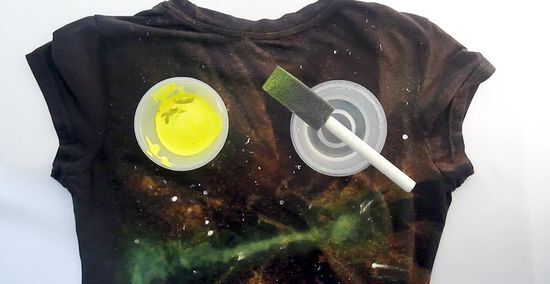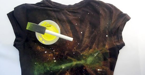 Blur the colors with water. Lighten and smooth the appearance of the paint by dabbing it with a water-soaked sponge or paper towel. When done, you should still be able to see any painted stars or bleached star clusters beneath the added paint. Blend until you achieve an effect that appeals to you. Some portions can be darker than others, but these extra colors should only be used to create depth. They should not be the focal point of the shirt.