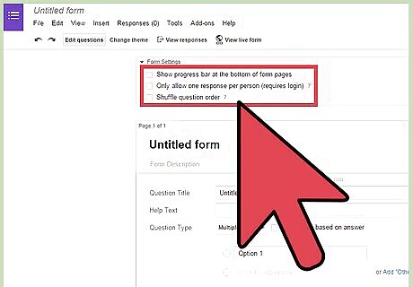 Set the survey settings. There are a few options found at the top of the page to control your survey settings. Check each of these, and tick the ones you’d like to apply on your survey. “Show progress bar at the bottom of form pages”—Tick this option if you want a progress bar displayed for every page of the survey. This will let the respondent know their overall progress in the survey. “Allow one response per person”—Tick this option if you want to limit responses to only one per respondent. This can be a good option to have if you don’t want to skew your results and only capture unique respondents. “Shuffle question order”—Tick this option if you want your questions to be shown in random to different respondents. This can be good if your questions aren’t related to each other or aren’t in sequential order.