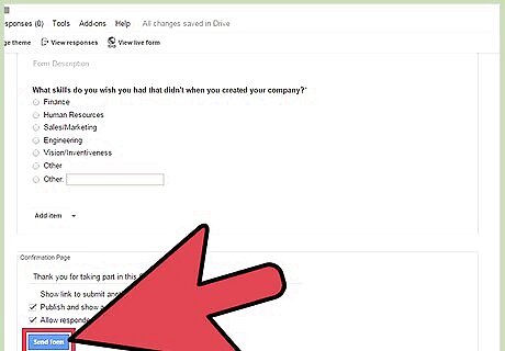 Send the form. Click the “Send form” button at the bottom of the page to save your survey and send it out. A window will appear to display the link to your survey form. Distribute this link to your respondents. All of their responses will be automatically recorded by Google Forms in a Google Spreadsheet file saved to your Google Drive. Sharing via social network—You can share this survey link via Google Plus, Facebook, and Twitter. Click on the appropriate social network buttons to proceed. Send via email—You can also directly share the survey via email. Type in the email addresses of your respondents in the last section on the window.